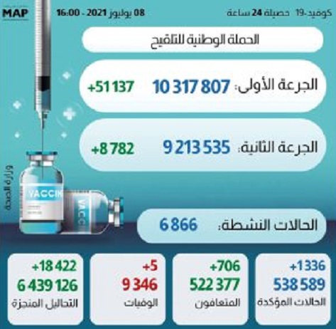 أما عدد الأشخاص الذين تلقوا الجرعة الأولى من اللقاح المضاد للكوفيد فبلغ 10 ملايين و317 ألف و807 شخصا، بينما وصل عدد المتلقين للجرعة الثانية إلى 9 ملايين و213 ألف و535 شخصا