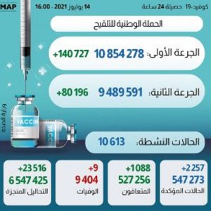 أما عدد الأشخاص الذين تلقوا الجرعة الأولى من اللقاح المضاد ل”كوفيد-19″، فبلغ 10 ملايين و854 الف و278 شخصا، بينما بلغ عدد المتلقين للجرعة الثانية 9 ملايين و489 ألف و591 شخصا.