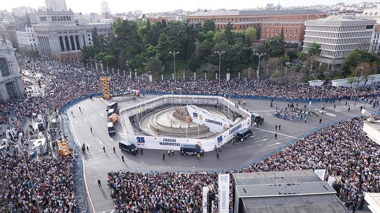 وبعد ذلك، توجه لاعبو ريال مدريد على متن حافلة مكشوفة إلى ساحة “سيبيليس” في العاصمة الإسبانية مدريد، من أجل الاحتفال مع الجماهير باللقب، لتشهد العاصمة مدريد احتفالات كبيرة.