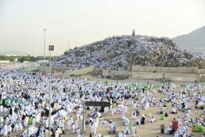 وفي عرفات يصلي الحجاج الظهر والعصر قصرا وجمعا جمع تقديم بأذان وإقامتين ويدعون بما تيسر لهم تأسيا بسنة النبي القائل “الحج عرفة” .