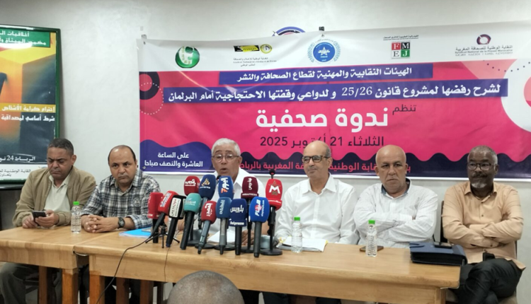 نظمت النقابة الوطنية للصحافة المغربية والفيدرالية المغربية لناشري الصحف،عدد من الهيئات المهنية والنقابية الرافضة لمشروع قانون رقم 26.25 المتعلق بإعادة تنظيم المجلس الوطني للصحافة. تدوة صحفية يومه الثلاثاء 21 أكتوبر 2025، تراسها رئيس النقابة عبد الكبير اخشيشن، إلى جانب ممثلي النقابات المهنية وعدد من الصحفيات والصحفيين من مختلف المنابر الوطنية، وذلك لتسليط الضوء على ما وصفوه بـ”المنعطف الخطير” الذي يمر منه قطاع الصحافة بالمغرب..