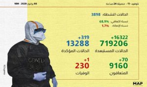 وأوضحت رئيسة مصلحة الأمراض الوبائية بمديرية علم الأوبئة ومكافحة الأمراض بالوزارة، السيدة هند الزين، في تصريح صحافي، أن الحصيلة الجديدة رفعت العدد الإجمالي لحالات الإصابة المؤكدة بالمملكة إلى 13 ألفا و288 حالة منذ الإعلان عن أول حالة في 2 مارس الماضي، ومجموع حالات الشفاء التام إلى 9160 حالة بنسبة تعاف تبلغ 70 في المائة، والوفيات إلى 230 بمعدل إماتة بلغ 1,7 في المائة.